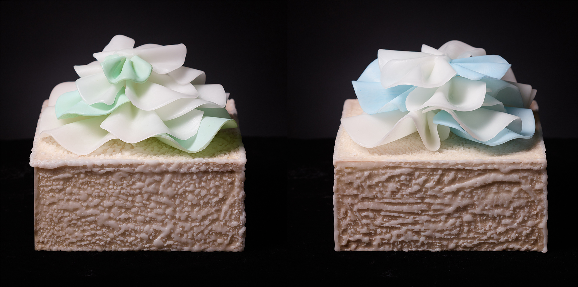 Because this sculpture is formed, with pure naturally-bleached pharmaceutical grade beeswax only, the material passes light through it, and glows internally from a nearby lamp which gives the sense of a living creature in your presence. It’s great as a conversation piece, can be used as a table centerpiece during dinner parties or when visitors stop by, it will definitely catch their eye! And for the more environmentally minded guests, can be used as a way to talk about ocean conservation. You can explain that it’s a type of cabbage coral currently impacted by ocean acidification. This sculpture is one that is considered a “healthy” version with an inspired color scheme not generally found on the ocean floor.