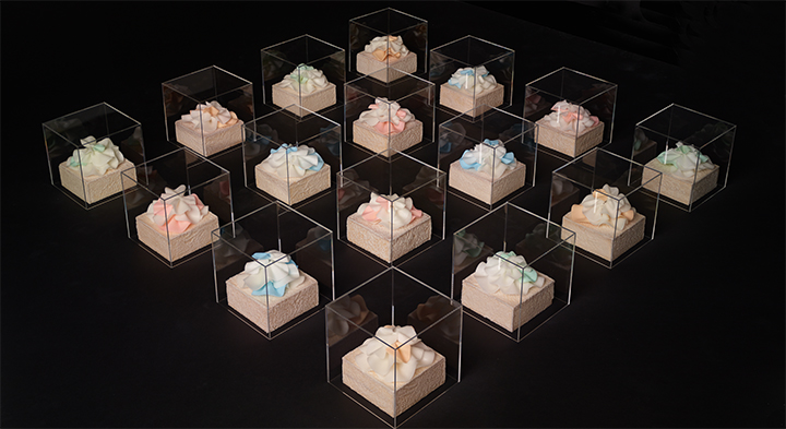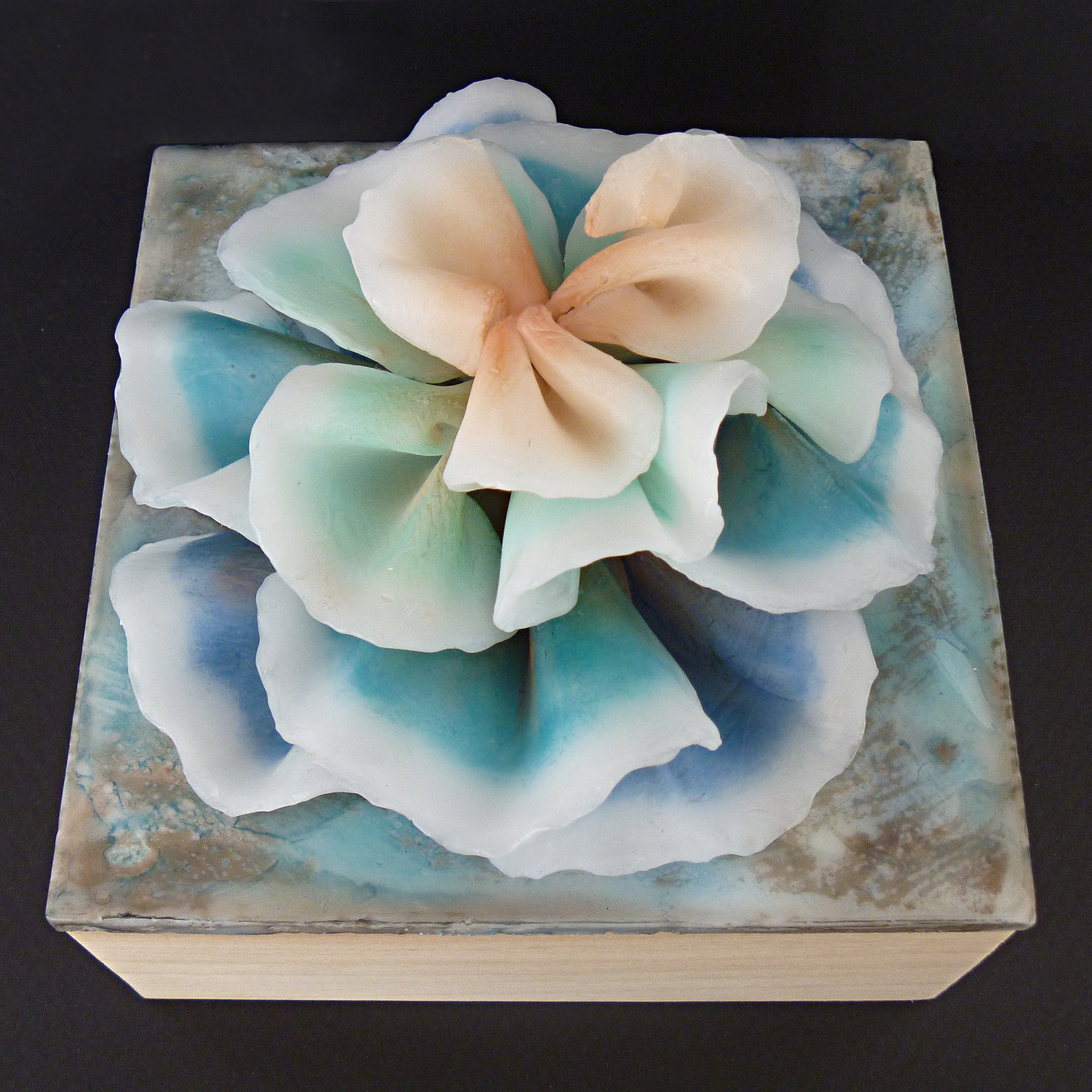 This encaustic 3D object is small enough at 6″ x 6″ x 6″ inches and protected by a clear acrylic case (included) making it at total dimension at 8″ x 8″ x 8″. The case keeps dust and little hands off the sculpture. I have found when I exhibit my sculptures, folks are very curious, have never seen such a unique sculpture before and are compelled to want to touch it. Which they should never do. So I include a case in the total price, for your convenience and to keep the artwork safe for many years to come. Perfect size for a table centerpiece, wedding table centerpiece or custom-made art give-aways for wedding guests. Fill out my contact page for info about bulk orders, time-frames, and discounts.