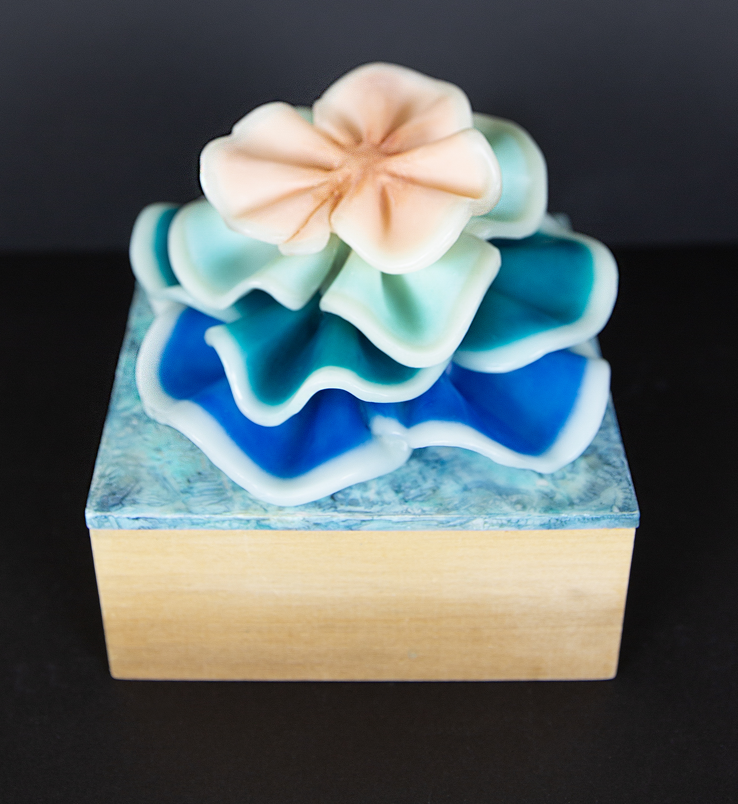 Ocean View is a captivating sculpture that evokes the beauty of the underwater world. The artwork is a 6 x 6 x 6″ encaustic and pastel piece on a birch base, depicting an abstracted flower or organic form. The delicate peach-hued layer at the top resembles the petals of a bloom, while the various shades of blue and teal below create a sense of depth and movement, reminiscent of ocean waves. The blue tones on the base complements the water-inspired theme of the sculpture and provides a solid grounding for the ascending soft forms. The overall composition is visually striking and harmonious, capturing the interconnectedness of nature.