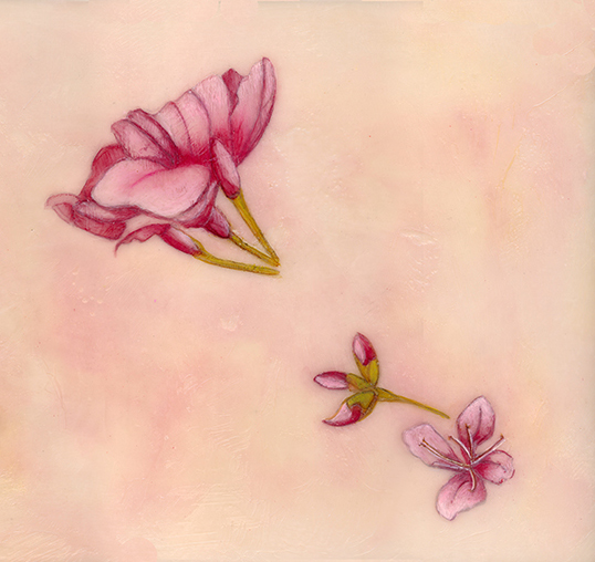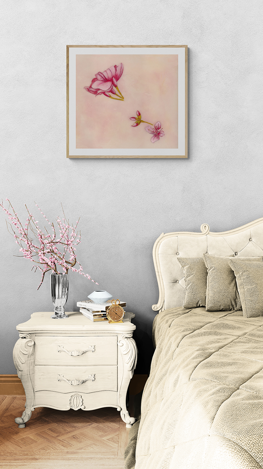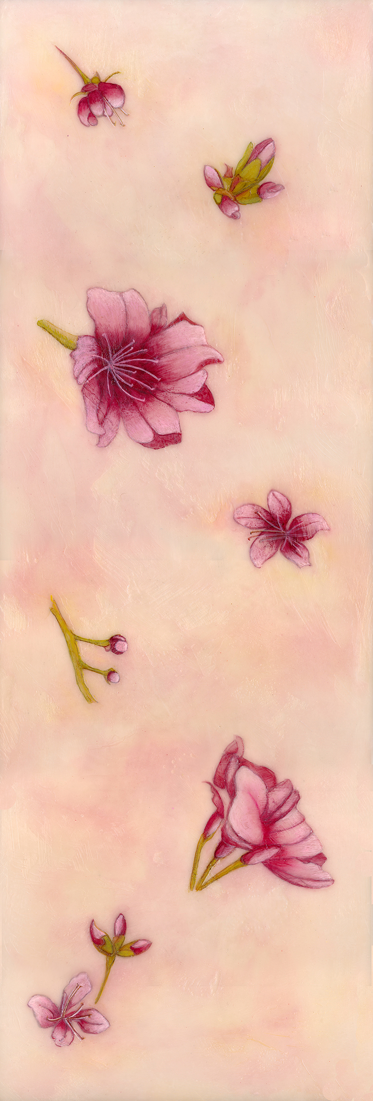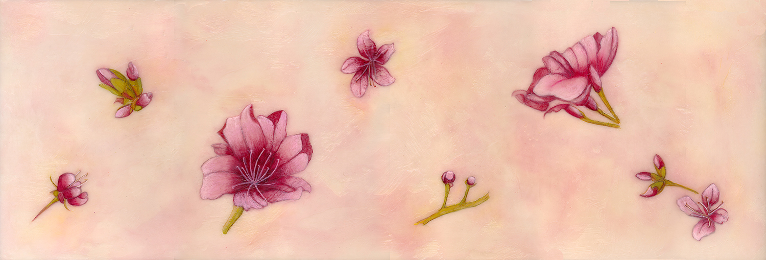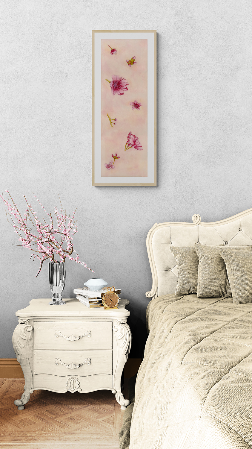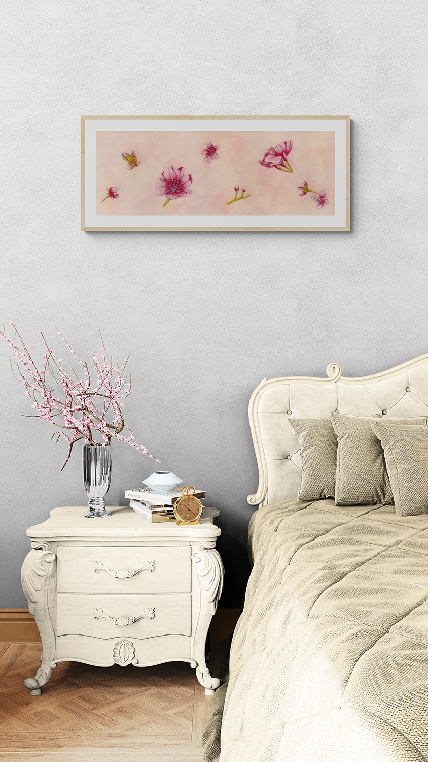 Inspired by the Cherry Blossom trees that bloom each spring in Washington, DC presented here is a limited-edition print. Based on the original encaustic painting (31.5″ x 10.75″) of these delicate blooms and buds with peach, pink and coral background colors. (Photography of prints is for example only with frame and matting not included.) Looks great either direction, portrait or landscape!
