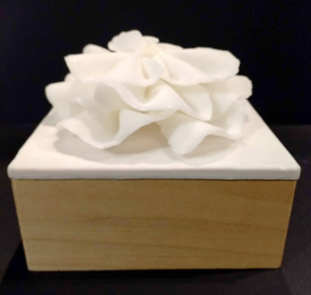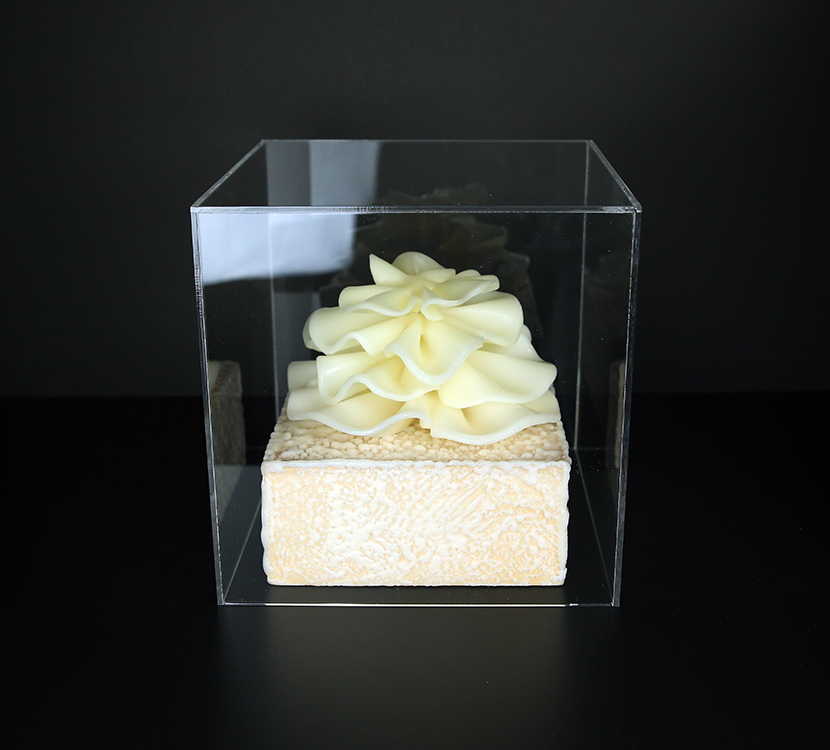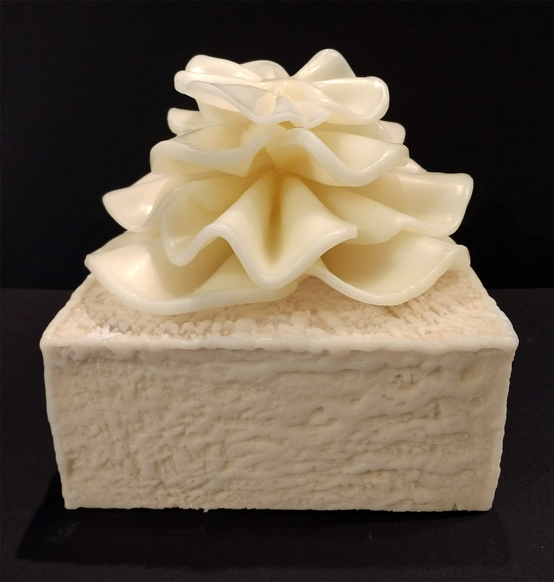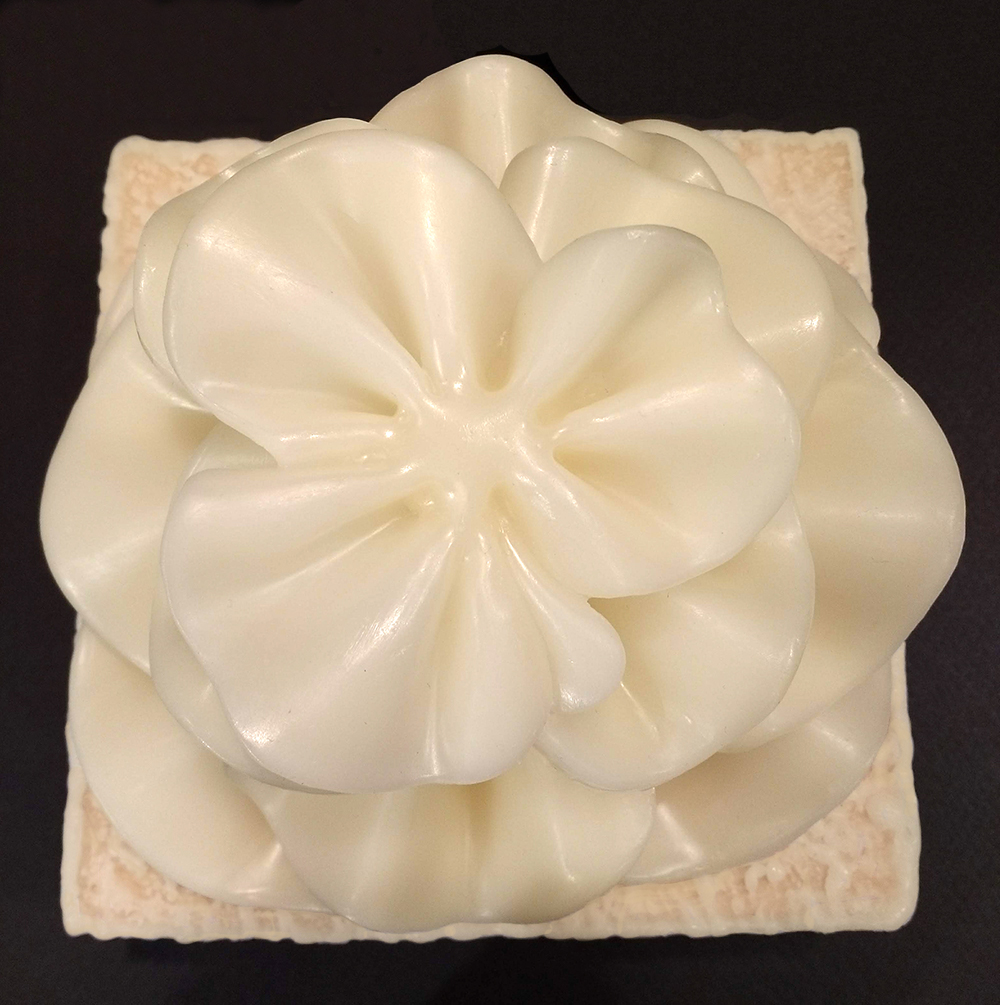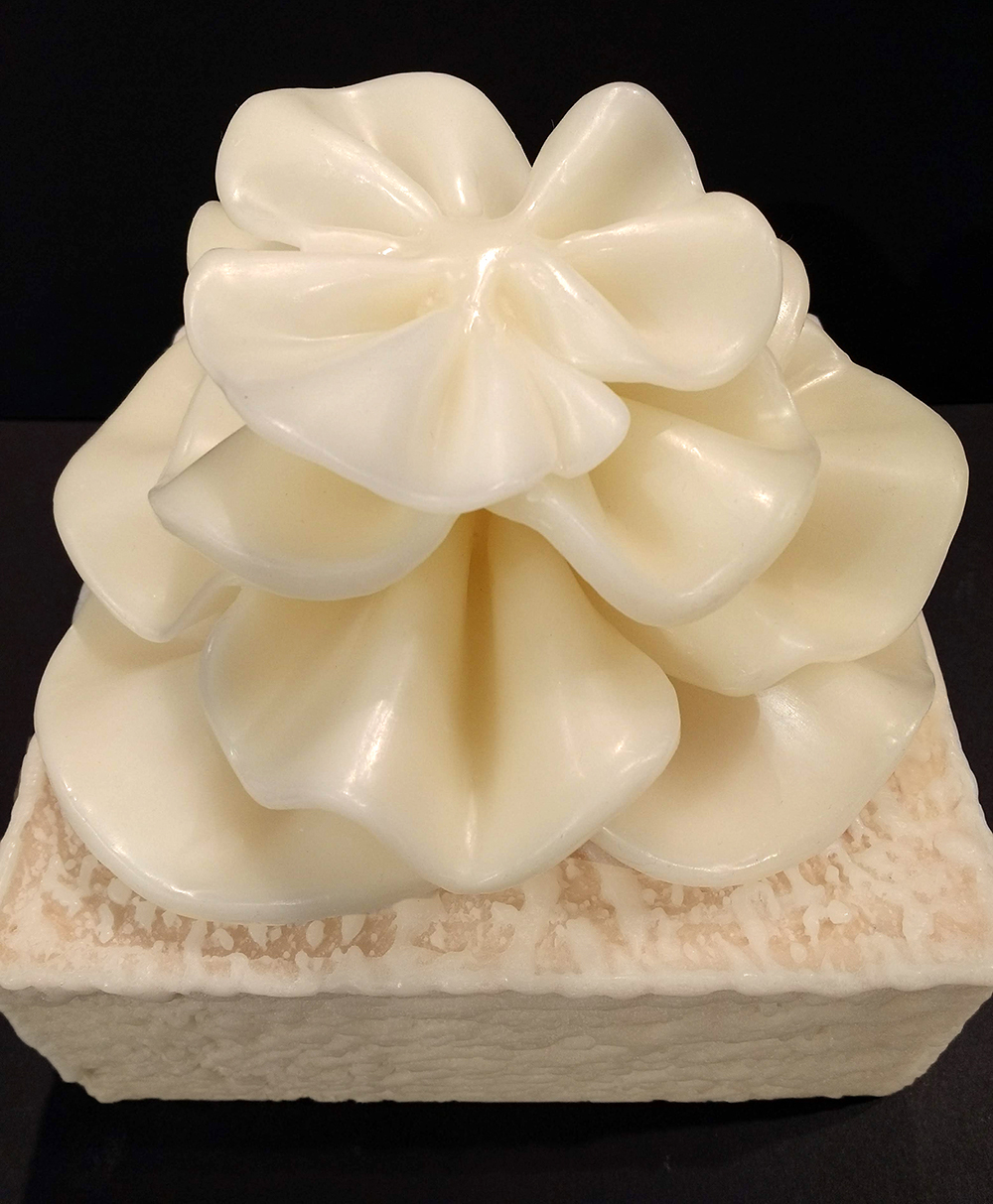 Emerging from this foundation is a form that captures the imagination. It is a mesmerizing representation of flowing petals, each one gracefully folding over and around its neighbor. Evoking the gentle undulations of ocean coral, these forms dance with fluidity and grace. The use of creamy, luminescent encaustic wax imbues the piece with a delicate glow, allowing light to dance across its surface and penetrate its depths. This unique interplay of materials and light breathes life into the sculpture, offering a glimpse into an underwater realm untouched by time.