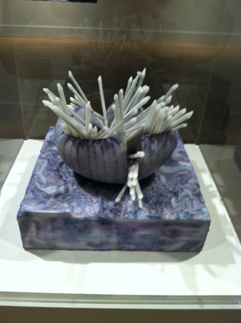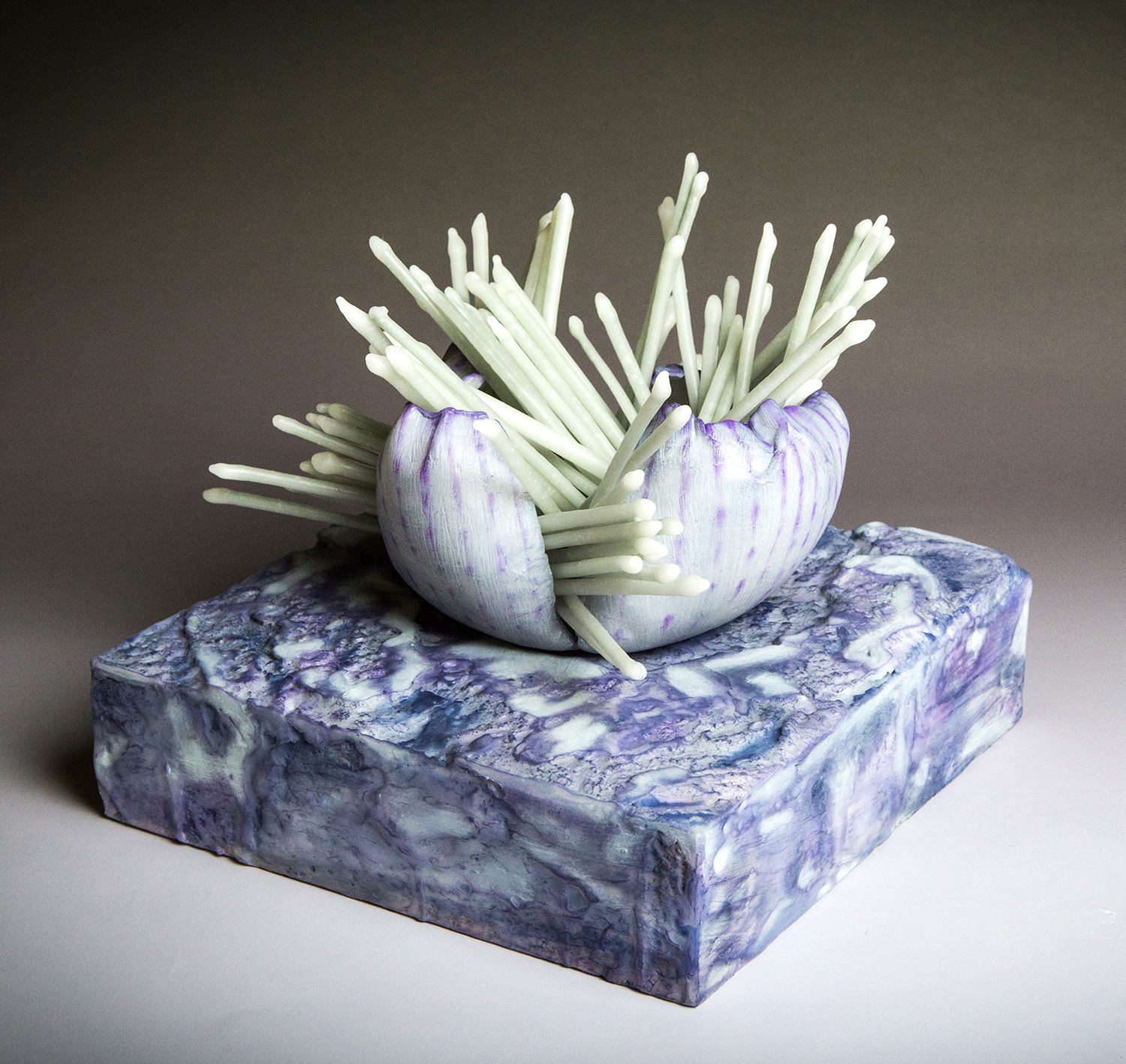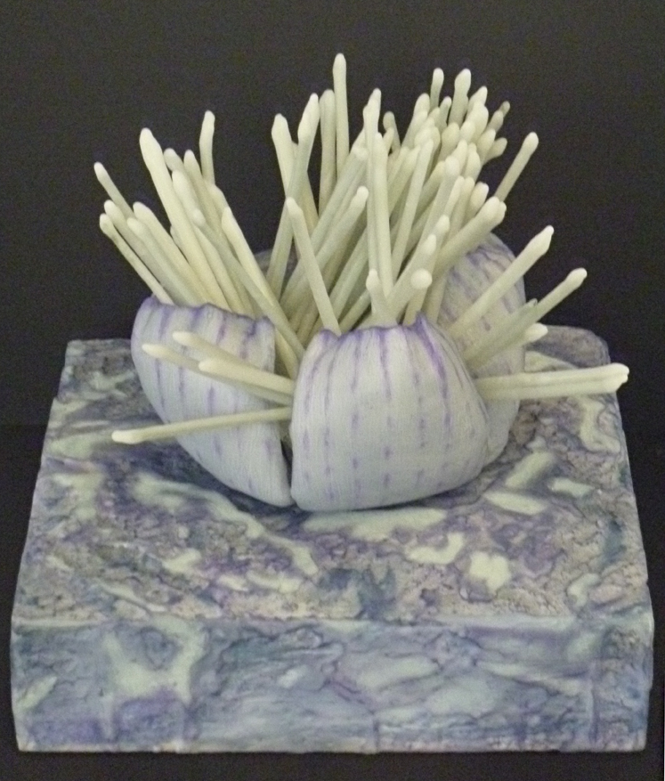 This artwork titled Sea Anemone in the past was classified as an animal, but now from two new genetic studies, these water-dwelling creatures are technically considered half plant and half animal. Inspired by a type of sea anemone called Heteractis Magnifica is a place for fish to dwell and thrive. My version here sculpted in encaustic beeswax, reflects a healthy anemone at the bottom of the ocean so a variety of fish can have a vital place for their habitat.